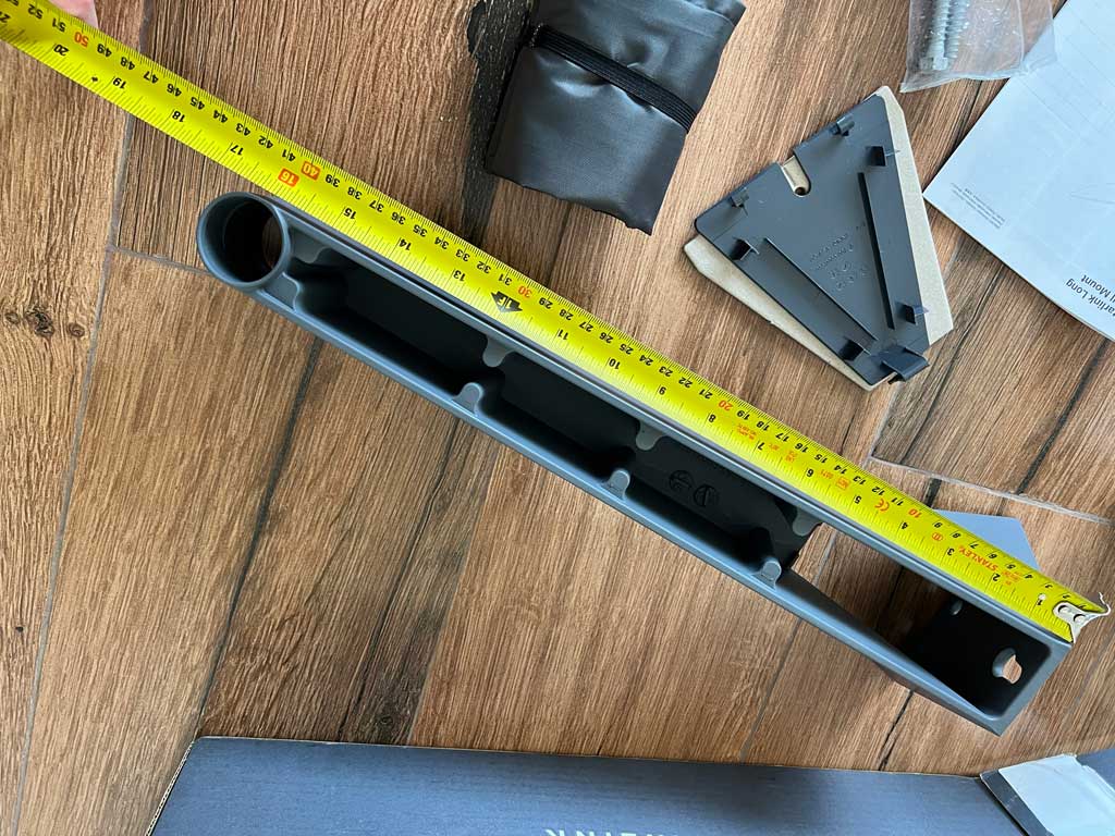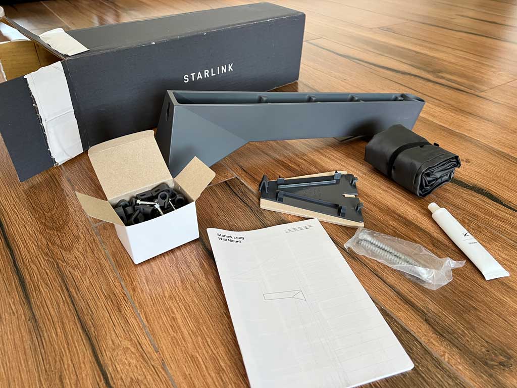 - A metal wall-mount arm to attach the StarLink antenna to a wall surface. It had the following dimensions: 43 cm long, 12 wide (at base), 6 cm wide (on top), 11 cm tall (at the mount base), with an inner diameter hole for the antenna arm being 3.5 cm.