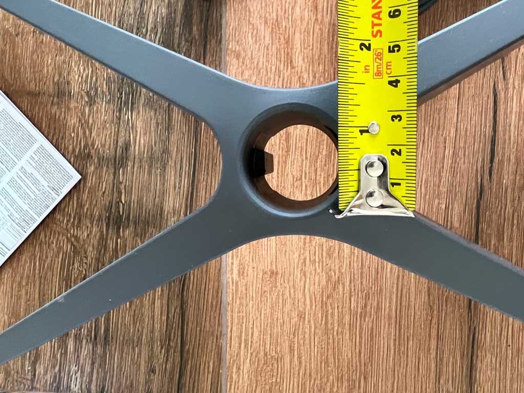 The diameter of the hole for the mounting arm for the StarLink antenna is 3 cm. The stand also has a latch to keep the antenna secured to the stand. One can release that latch by pressing a button on the side of the antenna arm.