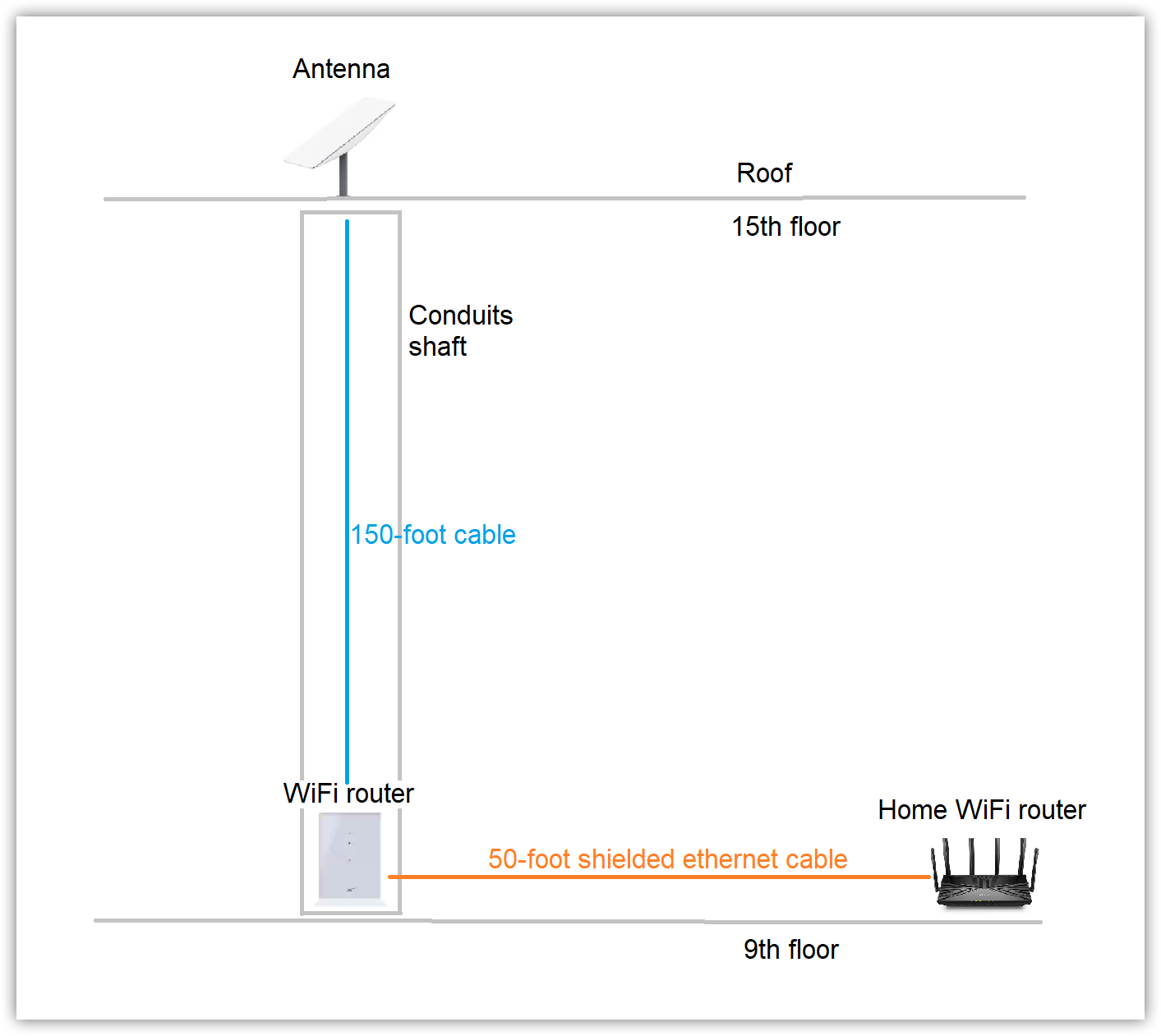 When I realized that the setup above created a very unstable system, I tried to adjust it by moving the WiFi router closer to the antenna and by staying within the rated 150-foot cable length. I then compensated for the 50-foot gap by trying to connect the StartLink WiFi router to my apartment WiFi router using a shielded 50-foot ethernet cable. This could be illustrated by the following schematic: